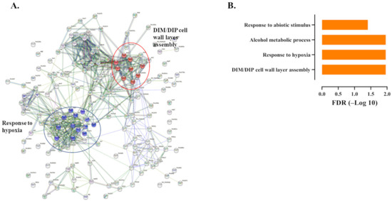 Protein-Protein interaction network of commonly up-regulated genes expressed by Mtb within 6 h of hSMs infection. (A) Protein-Protein interaction network of commonly up-regulated differentially expressed genes (n = 165) as deduced from the String database. The 2 top GO categories, DIM/DIP cell wall layer assembly (FDR 0.00031) and response to hypoxia (FDR 0.00031), are encircled. (B) Significant biological processes (FDR < 0.05) associated with the 165 commonly up-regulated differentially expressed genes by hSMs infected for 6 h with M. tuberculosis.