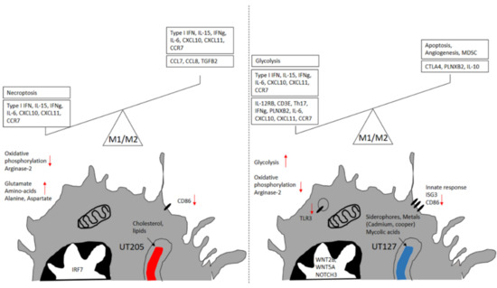 Although macrophage activation has been defined under different experimental settings [83], macrophage response’s M1/M2 paradigm under polarizing conditions has received remarkable attention. The M1 macrophages have been described as those responding to IFN-γ plus infection and a danger-associated molecular pattern (DAMPs). Conversely, M2 macrophages are influenced mainly by type-2 cytokines, IL-4. In this sense, macrophage ontogeny and micro-environmental signals shape the macrophage response to infection [84]. Furthermore, M2 macrophages are characterized by cholesterol homeostasis and lipid synthesis [81]. Thus, during early infection (6 h), no clear M1 or M2 polarized response is distinguished in hSMs infected with Mtb, prevailing an M1-like/M2-like phenotype in hSMs infected with UT205 or UT127, respectively. Although the M1/M2 paradigm seems to fit murine macrophages, recent data from human macrophages points to a more complex picture. It has been recently described that human alveolar macrophages from different human populations display a combined surface expression of M1 and M2 markers [85], and this hybrid phenotype may confer the ability of AMs for appropriate responses to stimuli and tissue environments [85]. This mixture of M1/M2 phenotypic markers has also been observed in human macrophages obtained from different pathological states [86,87,88]. Our results showed no clear distinction towards the M1 or M2 phenotype of hSMs infected with either clinical isolates of Mtb or infected macrophages, displaying genes associated with M1 and M2 phenotypes. As depicted in Figure 6, hSMs infected with the clinical isolates UT127 or UT205 responded to infection by expressing M1- and M2-associated markers. Infection with UT127 led to the expression of the M1 markers IL12RB, IL2RB, and IFNG, concomitantly expressing the M2 markers CTLA4, IL10, and PLXNB2 [83].