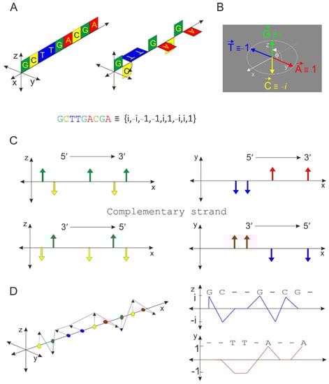 Figure 1. Basic properties of an orthogonal system. Standard sequence visualization is performed on two perpendicular planes, where nucleotides A + T are on the xy planes and C + G are on the xz planes. The nucleotide order is expressed by an integer value on the x-axis (A). There is a close analogy with the representation of complex integers (B), and a unit circle is used for this purpose. In the complex space, any oligonucleotide in the DNA sequence can be expressed instead of A, T, C, and G by four values: −1, 1, −i, and i, respectively. The complementary strand of DNA is a mirror image of the original sequence on a given plane of display (C). The sequence can be displayed in a complex space using vectors that can be projected into a real or complex plane (D).