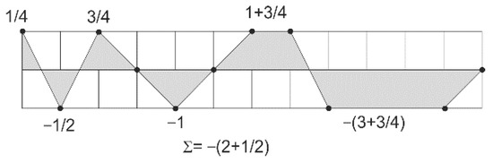 The profile of projection into the plane is given by the sequence, and an example of this is shown in Figure 2. The projection shows the following two sets of sequences: ATA(G/C)T(G/C)AATTTT(G/C) and GCG(A/T)C(A/T)GGCCCC(A/T). The area is not solely dependent on a given nucleotide, but is also influenced to some extent by the neighboring nucleotides. For example, the area in the xy plane given by the CAC sequence is equal to 1, the TAT is equal to 0.5, and the CAT is 0.75. The total area of a given sequence in Figure 2 in one of the projection planes, which achieves a negative value of −2.5. An important parameter is obtained if this value is divided by the number of nucleotides.