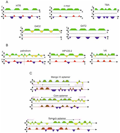 The orthogonal system was applied to a series of sequences that are known to be capable of forming a G-quadruplex motif. Five examples of G-quadruplex sequences, human telomeric repeats (HTR), c-myc promoter sequence, thrombin binding aptamer (TBA), d[(C(G4C2)3G4C], and d[T(G4T2)3G4T] are shown in Figure 3A. Each of the DNA sequences is capable of forming a relatively stable G-quadruplex structure in the presence of a potassium ion [19,20,21,22,23,24,25]. This set of sequences is displayed in the xz-projection.