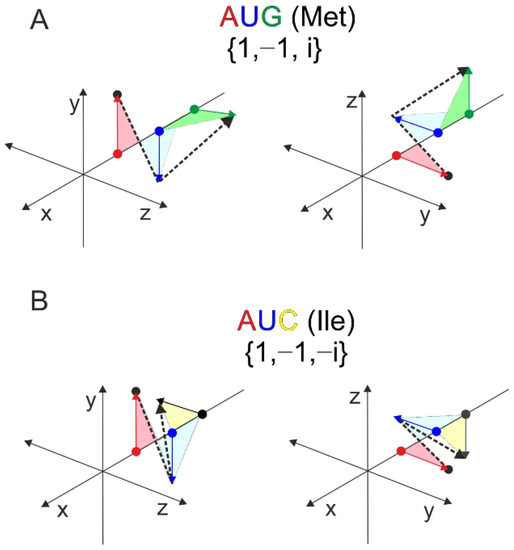 The 3D examples of the two mirror codons, the start codon-methionine and isoleucine are shown in Figure 5. Each pair of graphical representations is equivalent, the only difference being that they are shown from a different angle. Any triplet-nucleotide sequence can be represented by a single line (dashed lines). These types of graphical and numerical representations could be of considerable use in bioinformatic analyses [30].