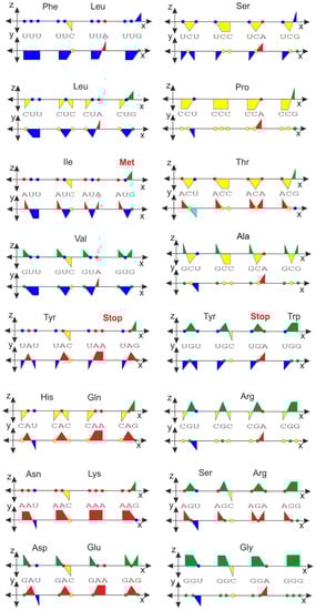 An even more interesting representation, analogous to the previous application for the DNA and RNA sequences, is shown in Figure 6. There is no ambiguity concerning which color is dominant for a particular group of codons. The different color coding of the codon tetrahedral representation has also been performed and described in a previous study, although the strategy used in that case was based on a slightly different but still complex basis [7]. Nevertheless, the orthogonal representation method is a simpler technique and can also be transformed into a tetrahedral representation.