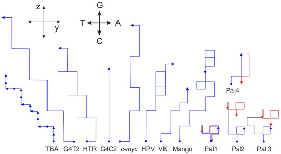 Analogically, the vector representation is also applicable for longer sequences. The sequences used for the projection in the xy- and xz-planes shown in Figure 3 are displayed in the vector representation in Figure 8. Again, the fact that G-quadruplexes show some features is confirmed. The sequences adopting biologically relevant G-quadruplexes also show a tendency not to turn right, a feature that may suggest that many As can exert some destabilization effect on G-quadruplex formation. If the start and end points in this presentation of the trajectory are identical, then the sequence consists of the same number of As and Ts and the same number of Gs and Cs. If the second half of the trajectory is identical to the first, then the sequence is a perfect palindrome, e.g., Pal1: d (GAGTCTGCAGACTC). However, the start and end points of imperfect palindromic sequences are not identical. Irrespective of the central sequence, which is not part of the palindromic region (black lines), the trajectory consists of two antiparallel sections, e.g., Pal2: d(GAGTCTGgggCAGACTC), Pal3: d(GAGTCTGtgaagCAGACTC) and Pal4: d(GAGGGaCCCTC).