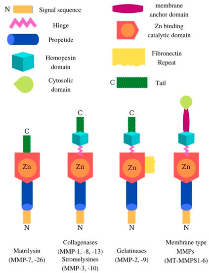 As previously mentioned, matrix metalloproteinases play a very important role in various physiological and pathological processes, being responsible for the degradation of extracellular matrix components such as fibers (collagen, elastin, laminin, and fibronectin) and the degradation of proteoglycans and polysaccharides [9,17]. These fibers are mostly collagen-containing glycoproteins, which are considered the main protein in the extracellular matrix. There is a common structure for most members of the metalloproteinase family that comprises a pro-peptide consisting of 80 amino acids with a variable-length N-terminal signaling peptide end, a catalytic domain containing a Zinc ion (170 amino acids), the hemopexin domain involved in collagen degradation (200 amino acids), and a region represented by a variable-length binding peptide, linking the catalytic domain to the hemopexin domain [30] (Figure 2). Despite the many similarities between the members of the MMP family, there are also differences. For example, MMP-7, -23, and -26 do not have the binding peptide or the hemopexin region, while MMP-14, -15, -16, and -24 also have a C-terminus end. MMP-23 exhibits a cysteine arrangement and an Ig-like domain instead of the binding region and the hemopexin domain [31].