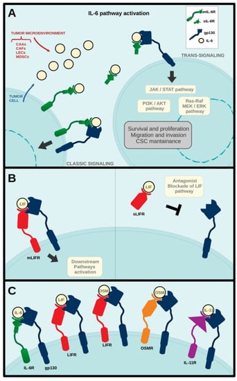 IL-6 cytokine pathway activation in breast cancer cells. IL-6 is secreted by tumor and stroma cells, such as cancer associated adipocytes (CAAs), cancer associated fibroblasts (CAFs), lymphatic endothelial cells (LECs), and myeloid derived stem cells (MDSCs). IL-6 binds to either transmembrane (mIL-6R) or soluble (sIL-6R) IL-6 receptor and to gp130 inducing ‘classic signaling’ through mIL-6R or ‘trans-signaling’ through sIL-6R (A). LIF binds to transmembrane LIF receptor (mLIFR) and gp130 inducing downstream signaling. LIF binding to soluble LIF receptors (sLIFR) blocks interaction with gp130 inhibiting LIF pathway activation (B). At the surface of target cells, secreted IL-6 cytokine family members bind to their specific receptors and gp130 to activate intracellular signaling cascades (C).