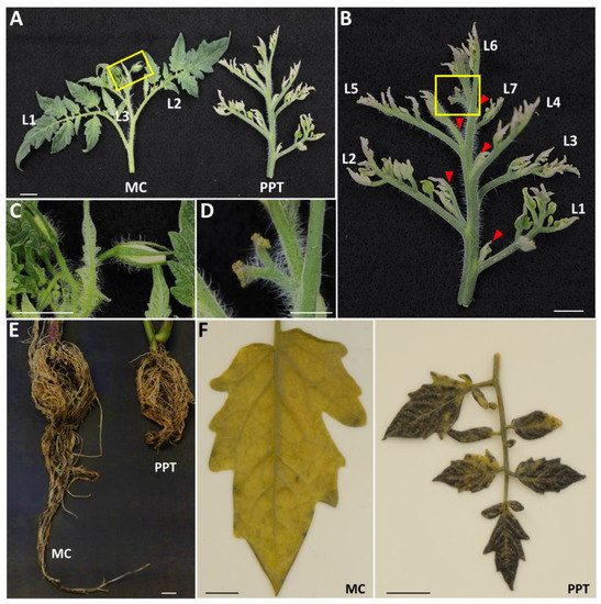 Potato purple top (PPT) phytoplasma infection-induced witches’-broom (WB), reduction in root system size and starch accumulation in leaf tissues. (A) PPT phytoplasma-induced typical WB in tomato plant (right panel) and a branch at the same developmental stage from mock control (MC) plant (left panel). (B) A closeup image of right panel of (A). Axillary buds initiated and outgrew from every leaf axil (shown by red triangles), exhibiting excessive branching. This was accompanied with little leaf and leaf chlorosis. Individual leaves are numbered. Yellow boxes indicate inflorescences and their closeup images are shown in (C,D). (C) MC inflorescence. (D) PPT phytoplasma-induced cauliflower-like inflorescence (CLI). (E) Root system reduction induced by PPT phytoplasma infection (shorter in length and loss of lateral roots, right panel) in contrast with roots of MC plant. (F) Lugol’s iodine solution staining for starch localization (purple pigments) in leaves of MC (left panel) and infected (right panel) plants. Scale bar = 1 cm.
