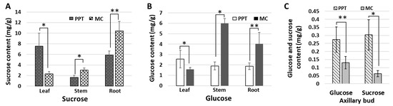 Sugar content measurement in different tissues of mock control (MC) and potato purple top (PPT) phytoplasma-infected tomato plants. (A,B) The contents of sucrose (A) and glucose (B) in leaf, stem, and root tissues of infected and MC plants. (C) Glucose and sucrose contents in newly released axillary buds (NR-AB) of infected and MC plants. Statistical significance * p < 0.01, ** p < 0.05.