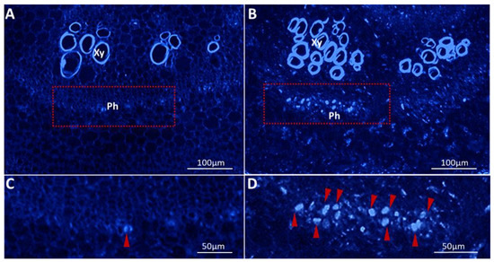 Aniline blue staining of callose deposition in the tomato plants induced by potato purple top (PPT) phytoplasma. (A,B) Cross stem sections of mock control and infected plants, respectively. (C,D) Closeup images of red rectangle boxes in (A,B), respectively. Red triangles show the callose deposition (bright blue fluorescence) in the phloem (indicated by Ph). Xy represents xylem.