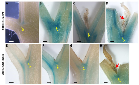 Arabidopsis response regulator 5 (ARR5), a response factor in the cytokinin signaling pathway, is induced by cytokinin. In many studies, the ARR5::GUS (β-glucuronidase) reporter construct has been used as a tool to localize active cytokinin [32]. In PPT phytoplasma-infected tomato plants, the cytokinin responsive signal was investigated at four different developmental stages during axillary bud initiation and outgrowth, including (i) leaf axil (bud not yet initiated), (ii) leaf axil (bud just initiated), (iii) newly initiated and outgrown bud, and (iv) newly elongated bud. Intense blue GUS staining was observed in the leaf axils where new axillary buds (LA-AB) could be formed (Figure 6B; Supplementary Figure S2), representing the ARR5 responsiveness to a large amount of cytokinin distribution, whereas only light blue GUS staining was visualized in the leaf axils where no axillary buds (LA-NO-AB) initiated (Figure 6A; Supplementary Figure S2). The intensity value (78.55 ± 1.25) in PPT-LA-AB was obviously stronger than that (143.90 ± 9.02) in PPT-LA-NO-AB (the GUS staining intensity was stronger, and the RGB value was lower because RGB white was RGB 255,255,255; RGB black was RGB 0,0,0. Supplementary Figure S2). In mock control plants, the intensity of GUS staining in LA-ABs (Figure 6F; Supplementary Figure S2) was slightly stronger than that in LA-NO-ABs (Figure 6E; Supplementary Figure S2), but the difference was not significant. In addition, it was obvious that a higher level of the cytokinin signal was detected in PPT-LA-ABs than mock-LA-ABs (Figure 6B,F; Supplementary Figure S2). Interestingly, cytokinin occurred at the leaf axils where the axillary buds initiated, but not in the axillary buds themselves (Figure 6C,G; Supplementary Figure S2). Only when a new branch was about to form an inflorescence did cytokinin signals move to the inflorescence and trigger the initiation and division of inflorescence meristems (Figure 6D,H and Figure 7A,B; Supplementary Figure S2).