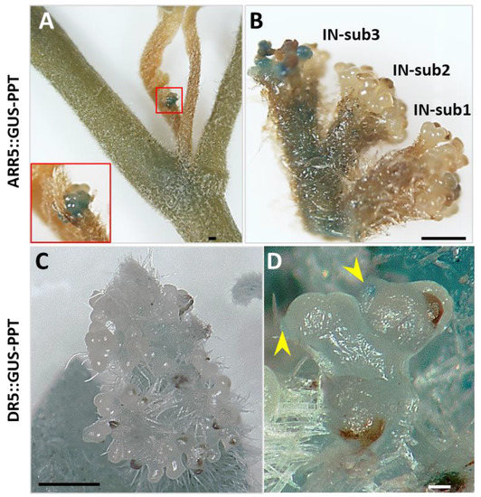 Spatial and temporal distribution patterns of cytokinin and auxin signals in potato purple top (PPT) phytoplasma-infected ARR5::GUS and DR5::GUS tomato transgenic plants. (A,B) ARR5::GUS cytokinin reporter line. (A) An outgrown branch with a new cauliflower-like inflorescence (CLI). Big red box is a closeup image of the small red box, showing indeterminate inflorescence meristems with a high level of cytokinin. (B) Cytokinin signal sequentially triggered the inflorescence branch development from inflorescence subbranch (IN-sub) 1 to 3. (C,D) DR5::GUS auxin reporter line. (C) PPT phytoplasma infection-induced CLI in DR5::GUS line. GUS staining (auxin signal) was not observed in CLI structure which is formed by indeterminate inflorescence meristems. (D) Occasionally, GUS staining (indicated by yellow arrowheads) could be visualized in floral meristems. Scale bar = 0.5 mm.