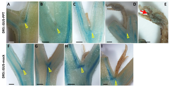 DR5 is a highly active synthetic auxin response element. A DR5::GUS reporter system has been widely used for the visualization of localized auxin responses [33]. Employing the DR5::GUS reporter line, the auxin responsive signal was also examined at four different developmental stages: (i) leaf axil (bud not yet initiated); (ii) leaf axil (bud just initiated); (iii) newly initiated and outgrown bud; and (iv) newly elongated bud. Light blue staining which reflects the auxin distribution was observed in mock-LA-NO-ABs and PPT-LA-NO-ABs (Figure 8A,F; Supplementary Figure S3). Strong blue GUS staining was observed in the leaf axils of newly initiated and released axillary buds of mock control plants (Figure 8G,H; Supplementary Figure S3), while no significant signal responsive to auxin was present in such buds of phytoplasma-infected plants (Figure 8B,C; Supplementary Figure S3). Considering the role of auxin in inhibiting axillary bud release, these results suggest that from initiation to release and elongation phytoplasma infection-induced axillary buds do not undergo the dormancy that healthy (mock) plants normally do. In addition, auxin localization could be visualized in newly outgrown and elongated infected axillary buds, especially in bud tips (Figure 8D,E), while not in the mock buds which were at the same developmental stage (Figure 8I; Supplementary Figure S3).