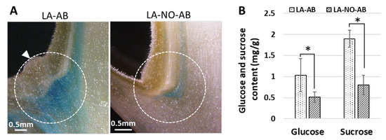Distribution of cytokinin responsive signal and sugar measurement in leaf axils of ARR5::GUS cytokinin reporter tomato plants infected with potato purple top (PPT) phytoplasma. (A) Intense GUS staining (reflecting high level of cytokinin) in leaf axil where a new axillary bud initiated, LA-AB (leaf panel) and light GUS staining (a small amount of cytokinin signal) in leaf axil where no axillary bud initiated, LA-NO-AB (right panel). The newly initiated bud was indicated by a white triangle. Leaf Axils (LA-ABs and LA-NO-ABs) with white circles were sampled for sugar content assessment. (B) Glucose and sucrose contents in leaf axils (LA-ABs and LA-NO-ABs) of PPT phytoplasma-infected plants. Statistical significance * p < 0.01.