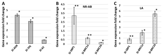 In Arabidopsis, BRANCHED1 (BRC1, SLs marker gene) and squamosa promoter-binding proteins (SPLs) have been reported to control axillary bud outgrowth [12,37]. In this study, the expression patterns of three tomato orthologs Sl-BRC1a, Sl-BRC1b, and Sl-SBP1 (SPL9/15 in Arabidopsis) in the LA-ABs and newly released axillary buds (NR-ABs) were determined by qRT-PCR. Sl-BRC1a and Sl-BRC1b were up-regulated, and Sl-SBP1 was slightly down-regulated in LA-ABs compared with LA-NO-ABs (Figure 10C). On the other hand, Sl-BRC1a and Sl-BRC1b were down-regulated, and Sl-SBP1 was up-regulated in infected NR-ABs compared with NR-ABs in the mock control plants (Figure 10B).