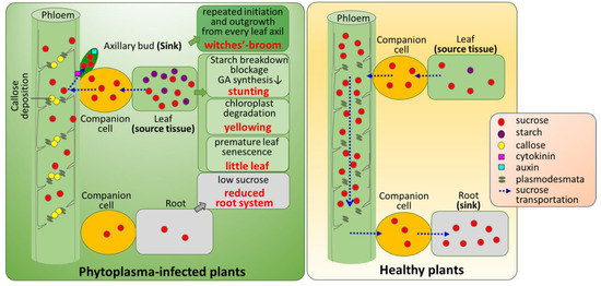 To reach this goal, in the present study, sugar content was measured in different tissues of PPT phytoplasma-infected tomato plants. In addition, the spatiotemporal distribution patterns of auxin and cytokinins were also investigated by employing transgenic auxin and cytokinin reporter lines. The results indicated that sugar metabolism was severely impaired and sucrose transportation through phloem was impeded, which led to sucrose reallocation to new sink tissues (leaf axils and axillary buds). Reduced phloem translocation due to the reduction of sieve pores caused by excessive callose deposition also demonstrated impaired sugar transport. Transmission electron microscopy (TEM) revealed that the starch breakdown was inhibited, and the degradation of chloroplasts occurred in the infected source leaves. The levels of cytokinins elevated in the leaf axils, which favored the initiation of new lateral buds. Based on these results, a working model was proposed to elucidate how a phytoplasma infection impairs sugar metabolism and transportation in plants, leading to leaf chlorosis, little leaf, stunting, root system reduction, and WB symptoms.