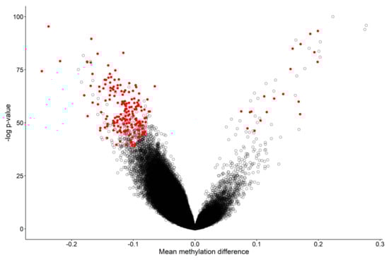 Volcano plot of methylation difference between 41 WDSTS samples and controls versus statistical significance (-log p-value) of individual probes. Red dots represent selected, significant differentially methylated probes (DMPs). Positive and negative mean methylation difference show hypermethylation and hypomethylation, respectively.