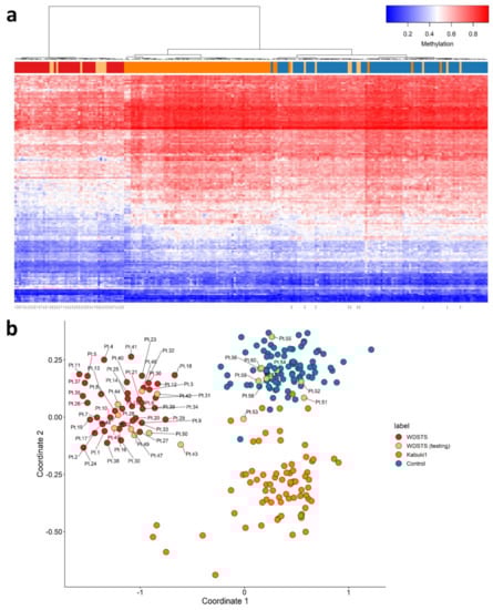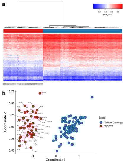 Identification of a WDSTS episignature. (a) Hierarchical clustering with Ward’s method on Euclidean distance was performed. In the heatmap plot, each row illustrates a selected CpG site, and each column is related to a sample. The heatmap color scale indicates the range of methylation level; from blue (no methylation or 0) to red (full methylation or 1). This plot conveys that the detected episignature clearly differentiates between 41 WDSTS samples and controls; (b) multidimensional scaling (MDS) plot using the selected probes. MDS plot illustrates power of the signature in separating the 41 WDSTS samples and control samples. Blue circles represent control subjects and red circles indicate subjects with pathogenic variants in the KMT2A gene and a confirmed diagnosis of the syndrome.