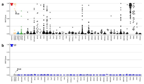 Two methylation variant pathogenicity (MVP) plots were generated to confirm specificity of the classification model. In the first MVP plot where the support vector machine classifier (SVM) was trained by comparing the 41 WDSTS samples against controls, the classifier showed a high sensitivity for all WDSTS cases and nine WDSTS (testing) samples (including four samples without known KMT2A variants (Pt.42, Pt.44, Pt.45, Pt.50), one with a canonical -1 splice site variant (Pt.43), one with a nonsense variant (Pt.49), two out of 11 with a missense variant (Pt.46, Pt.47), and one out of two with an in-frame deletion (Pt.48)), with all samples scoring high on the MVP score axis (Figure 3a), further confirming the previous heatmap and MDS results. Some samples from control (testing) as well as other disease cohorts available in EKD (including BAFopathy complex, Börjeson–Forssman–Lehmann syndrome (BFLS), Cornelia de Lange syndrome (CdLS), CHARGE, Down, Kabuki (including Kabuki1 and Kabuki2), Rubinstein–Taybi syndrome (RSTS), Sotos, and Tatton–Brown–Rahman syndrome (TBRS) plus one sample from (Alpha thalassemia/mental retardation X-linked syndrome) ATRX, Blepharophimosis-impaired intellectual development syndrome SMARCA2 Syndrome (BISS), Kleefstra, Mental retardation, X-linked, Snyder–Robinson type (MRXSSR), and SETD1B cohorts) showed an elevated MVP score, suggesting level of similarity in the DNA methylation profiles between these disorders.