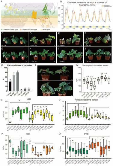 Phenotypic characterization of thermo-tolerant and thermo-sensitive cucumber under high-temperature stress. (A) Planting and distribution areas of the North China type TS and South China type TT. The asterisk position represents the experimental cultivation area (green and yellow), while the numbers represent the latitude. The size of the circle represents the approximate distribution of different types of cucumber varieties. (B) Temperature statistics of farming areas in Guangzhou, China, for a week in July. On the horizontal axis, blue represents night, while beige denotes day temperatures. The value of each point represents the average temperature for three hours. (C–J) Characterization of thermo-sensitive TS and thermo-tolerant TT lines. 3 days (D,H), 6 days (E,I), and recovered 3 days (F,J) (28 °C daytime/25 °C night) after high-temperature stress (43 °C daytime/25 °C night). TS and TT represent the thermo-sensitive and thermo-tolerant cucumber inbred lines. HT, high temperature; 3D, 3 day; 6D, 6 day; and R, recovered. (K) Death rate of 02 and 14 lines after high-temperature exposure. (L,M) Hyponasty angle between lamina and petiole after high-temperature exposure. (N–Q) Changes in the MDA (malondialdehyde) content, relative conductivity, SOD (superoxide dismutase), and POD (peroxidase) enzyme activities in thermosensitive TS and thermo-tolerant TT cucumber leaves after high-temperature stress. Scale bars represent 1 cm in (C–J,L). Values are the means ± SE (n = 30) in (M–Q). Relative to CK, ** in M-Q indicate significant differences of p < 0.01 by t-test, and * indicates p < 0.05 by t-test. FW, sample fresh weight; U/g FW, enzyme viability unit per gram of fresh weight; and U/g FW min, the enzyme activity unit per minute of fresh weight change. The % of relative electrolyte leakage indicates the relative electrolyte extravasation rate.