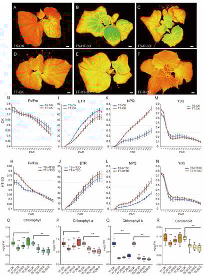 Chlorophyll fluorescence of thermo-sensitive and thermo-tolerant lines after high-temperature stress. (A–F) Chlorophyll fluorescence (Fv/Fm) of the TS and TT lines after high-temperature stress. The orange-red color indicates a stable photosynthetic system in leaves, while the green color indicates an unstable photosynthetic system. (G–N) The maximum quantum yield of PS II photochemistry (Fv/Fm) (G,H), the relative electron transfer rate (ETR) (I,J), non-photochemical quenching (NPQ) (K,L), the effective quantum yield of photochemical energy conversion in PS II (Y(II)) (M,N) of TS and TT lines after high-temperature stress. PAR denotes Photosynthetically Active Radiation. (O–R) The content changes of chlorophyll II, chlorophyll II a, chlorophyll II b, and carotenoids of TS and TT lines after high-temperature stress. Scale bars represent 1 cm in (A–F). Values are the means ± SE (n = 30) in (G–R). ** in O-R indicate significant differences of p < 0.01 by t-test, and one asterisk indicates p < 0.05 by t-test.