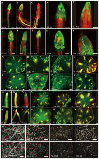 Cell viability and reactive oxygen accumulation in cucumber root and stem after high-temperature stress. (A–F), Characterization of cell viability in the root of TS (A–C) and TT (D–F) after high-temperature stress. (A’,B’,D’,E’) are amplifications of figures (A,B,D,E), respectively. Red fluorescence represents dead cells as revealed by PI (propidium iodide) staining, while the green fluorescence represents the living cells as revealed by FDA (Di-O-acetylfluorescein) staining. (G–L), the cell viability of the vascular system in the stem of TS (G–I) and TT (J–L) after high-temperature stress. (H’,K’) are amplifications of figures (H,K), respectively. Red fluorescence represents the dead cells stained by PI, while the green fluorescence represents the living cells dyed by FDA. (M–X), the characterization of reactive oxygen in the root (M–R) and stem (S–X) after high-temperature stress. The red fluorescence represents reactive oxygen concentrated region, the green is spontaneous fluorescence of plants, while yellow represents an overlap of red and green fluorescence. (Y,Z), the root system of cucumber in the soil layer for TS and TT plants after heat stress. TS and TT represent the thermo-sensitive and thermo-tolerant cucumber inbred lines. HT, high temperature; 3D, 3 day; 6D, 6 day; and R, recovered. Scale bars represent 100 µm in (A–C,F,G,I), 200 µm in (D,E,H,J), and 1 cm in (Y,Z).