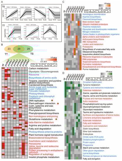 The cluster analysis revealed four significant expression patterns in TS after heat treatment, while TT plants had only three significant patterns. Genes in profiles 0 and 1 were down-regulated and upregulated at profiles 6 and 7 (Figure 4A). The significantly enriched (p < 0.05) pathways were extracted to understand heat resistance between the two varieties. A Venn diagram showed the correlation (Figure 4B). There were 58 significant pathways in TS and 52 in TT with 29 identical and 15 similar expression patterns.