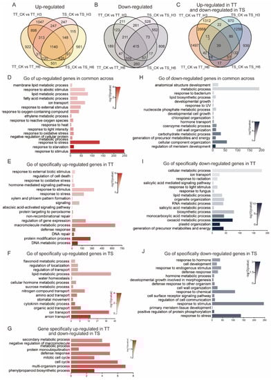 Venn clustering showed that high temperature upregulated 6826 and down-regulated 4111 genes in TT and TS plants (Figure 5A–C). Of these, 1140 upregulated and 415 down-regulated genes were common to both varieties (Figure 5A,B). Gene Ontology (GO) enrichment analysis revealed that the commonly upregulated genes control responses to stimulus, stress, and heat (Figure 5D). However, the common down-regulated genes were related to metabolic processes, cellular component organization, and development (Figure 5H).