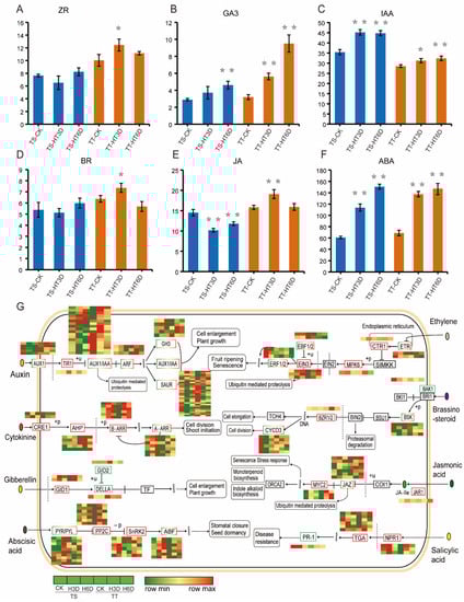 High temperature affected several hormone synthesis precursors and signal transduction pathways (Figure 4). Under the normal environment, TT and TS plants had similar levels of gibberellin (GA), jasmonic acid (JA), brassinolide (BR), and abscisic acid (ABA), while TT had less auxin (IAA) and more cytokinin (ZR) than did TS (Figure 6A–F). After high-temperature treatment, the contents of ZR, BR, and JA were higher in TT than in TS plants (Figure 6A–F). However, GA increased in both varieties but was higher in TT after high-temperature stress (Figure 6B). Heat treatment boosted IAA and GA in TT and TS (Figure 6C–F).