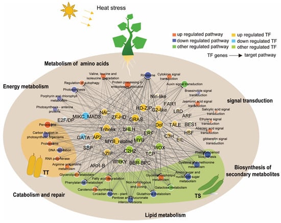 Heat stress specifically enriched the lipid metabolism, metabolism of amino acids, and biosynthesis of secondary metabolites in TS. Repair, catabolism, and the energy metabolism were specifically enriched in TT. Heat stress upregulated most transcription factor families, such as HSF, bZIP, NAC, ARF, and DOF, while the GATA family was down-regulated. The bHLH, WRKY, and ERF families had polarized expression (Figure 7, Supplementary Materials Figure S5).