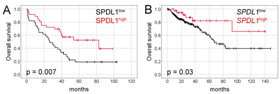 Kaplan-Meier analysis demonstrated that the median overall survival (OS) was significantly longer in patients with SPDL1-high tumors than in those with SPDL1-low tumors (82 months, 95% confidence interval [CI] 21.9–143.4 vs. 26 months, 95% CI 17.0–35.6, respectively, p = 0.007, Figure 2A).