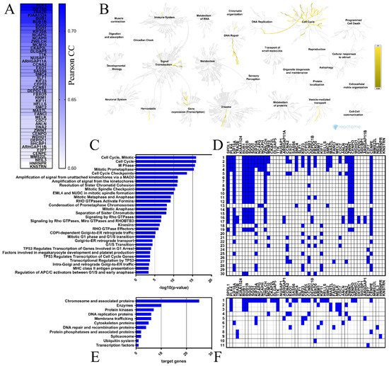 Functional enrichment analyses for the top 50 genes positively correlated with SPDL1 in CRC. (A) These genes are depicted with the corresponding Pearson correlation coefficient (Pearson CC) values. (B) The Reactome Pathway hierarchy panel. (C) Bar chart of the top 30 Reactome pathways based on the enrichment scores [−log10 (p-value)]. (D) Heatmap of the top 30 Reactome pathways based on the target genes. (E) Bar chart for all terms in BRITE functional hierarchies. The horizontal axis represents the number of genes enriched in KEGG Brite terms represented on the vertical axis. (F) Heatmap for all terms in BRITE functional hierarchies based on the target genes.