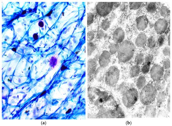 (a) Metachromatic properties of MC granules. Light microscopy, Toluidin blue, magnification × 40; (b) localization of tryptase in MC granules. Electron microscopy, magnification × 2500.