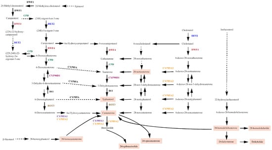 - Ohnishi, T.; Szatmari, A.-M.; Watanabe, B.; Fujita, S.; Bancos, S.; Koncz, C.; Lafos, M.; Shibata, K.; Yokota, T.; Sakata, K.; et al. C-23 Hydroxylation by Arabidopsis CYP90C1 and CYP90D1 Reveals a Novel Shortcut in Brassinosteroid Biosynthesis. Plant Cell 2006, 18, 3275–3288. [Google Scholar] [CrossRef] [PubMed] [Green Version]
