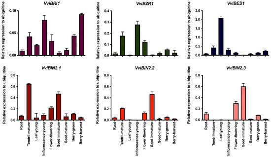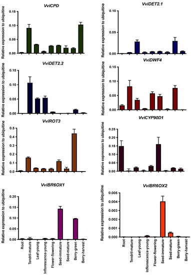 3.2. Tissue- and Development-Specific Expression Profile of Genes Involved in the Brassinosteroid Pathway in Grapevines