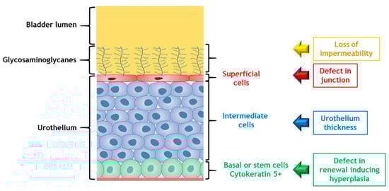 Abnormalities in urothelium regeneration and loss of impermeability.
