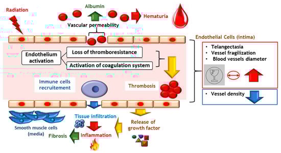 In survivors of radiation-treated cancers, vascular damage contributes to the initiation and subsequent progression of radiation-induced tissue damage []. Ionizing radiation, through its effects on the endothelium, mediates initiation and progression of radiation-induced damage to healthy tissue. Endothelial apoptosis increases vascular permeability, endothelial activation and recruitment of inflammatory cells, and activation of the coagulation system, contributing to the progression of radiation-induced tissue damage []. Endothelial cells play a key role in the control of vascular tonicity by secreting molecules that act on vascular smooth muscle cells []. The main effects are radiation-induced cell death, loss of thromboresistance and secretion of soluble factors, such as cytokines or growth factors. Thrombomodulin deficiency is demonstrated after irradiation and is chronically perpetuated in rats and humans [,]. The mechanisms responsible for the decrease in thrombomodulin expression are related both to the direct effects of irradiation through the production of reactive oxygen species and to indirect secondary effects related to radiation-induced inflammation []. The loss of endothelial thromboresistance following ionizing stress results from the stimulation of fibrinogenesis and a decrease in fibrinolysis associated with overexpression of tissue factor [], von Willebrand factor [] and a decrease in the expression of prostacyclin [] and thrombomodulin []. Activation of the coagulation system is one of the physiological processes stimulated after irradiation. The endothelium is in a chronic procoagulant state, which may contribute to the long-term persistence of the deleterious effects of irradiation. A correlation exists between vascular thickening and radiation-induced tissue damage []. The late effects are tissue hypoxia related to vascular ischemia and chronicity of endothelial dysfunction (Figure 6).