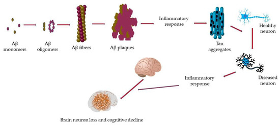 Path to cognitive decline in neurodegeneration. Amyloid-beta (Aβ) monomers clump together to form oligomers of variant structures. Subsequently, the oligomers aggregate to form Aβ fibers, which misarrange to form Aβ plaques. Plaque formation induces an inflammatory response which includes the formation of tau aggregates leading to the conversion of healthy neurons to diseased neurons. The presence of more diseased neurons triggers another inflammatory response leading to more neuron loss and a subsequent loss in brain function as well as cognitive decline.