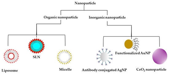 Types of nanoparticles most commonly used for the management of neurodegenerative disorders. SLN—solid lipid nanoparticle; AuNP—gold nanoparticle, AgNP—silver nanoparticle, CeO2 NP—cerium oxide nanoparticle.