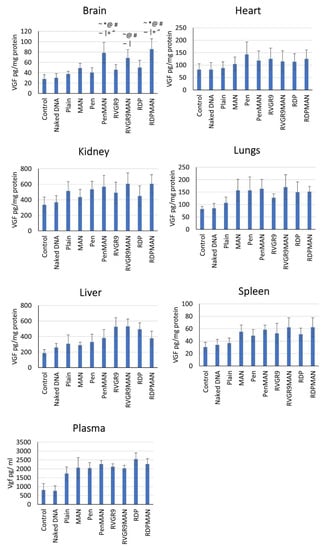 In vivo vgf transfection in brain and other major organs in mice. Data shown as mean ± SD of 6 animals per group. ~, |, @, #, *, –, +, and “ show statistically significant difference (p < 0.05) from control, naked DNA, plain, Pen, MAN, CGN, RVG9R and RDP liposomes, respectively. Source: Reprinted from Arora, S.; Singh, J. In vitro and in vivo optimization of liposomal nanoparticles based brain targeted vgf gene therapy. International Journal of Pharmaceutics 2021, 608, 121095 [122]. With permission from Elsevier.