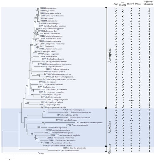 Maximum likelihood phylogenetic tree of DPPI. The tree was rooted using the sequence of papain from Carica papaya as an outgroup. Only bootstrap values above 75 are shown. The table on the right highlights the conservation of characteristic features of human DPPI, i.e., Asp 1, free Cys331, Cl- binding residues in the S2 binding pocket (Phe278, Tyr280) and the number of predicted N-glycosylation sites (✓—conserved; ×—not conserved; *—Tyr is present instead of Phe; **—Ile is present instead of Phe; ***—Trp is present instead of Phe; °—Phe is present instead of Tyr).