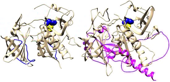 Structural comparison of Amorphea and Alveolate DPPI. The crystal structure of a single subunit of human DPPI is shown on the left (PDB accession code 1k3b), and the homology model of Plasmodium falciparum DPAPI built by AlphaFold [] is shown on the right. Regions containing insertions of significant length in the latter are highlighted in blue and magenta, respectively. The catalytic diad Cys–His is shown as yellow and blue spheres.