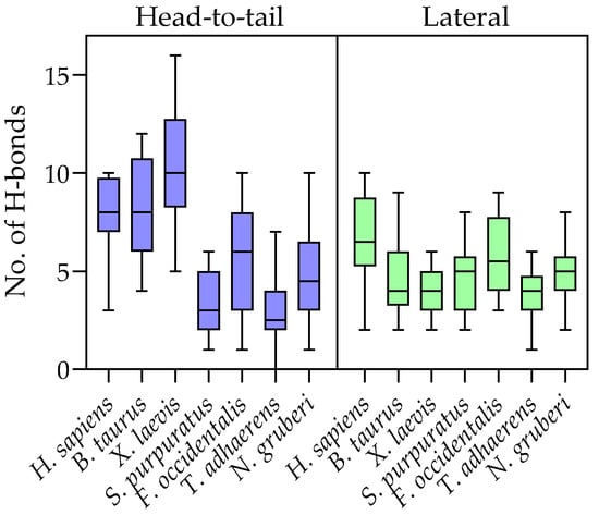 The human DPPI tetramer is constructed as a dimer of dimers, and it has been proposed that it assembles stepwise via a dimeric intermediate form at the proenzyme stage. There are two distinct sets of isologous subunit interfaces resulting from head-to-tail and lateral interactions (see Figure 1b). The head-to-tail interaction involves a buried surface area (BSA) of about 1100 Å2, and the lateral interaction involves a BSA of about 700 Å2. Statistically, protein–protein interaction surfaces of similar size contain, on average, four to six hydrogen bonds []. In the analyzed crystal structure of human DPPI (PDB accession code 1k3b), ten hydrogen bonds were detected in the head-to-tail interaction and twelve in the lateral interaction. In an effort to predict the oligomeric states of Amorphea DPPIs from divergent lineages, we constructed homology models of the putative tetrameric forms of six orthologs covering the diversity of DPPIs. For this task, Modeller [] was chosen over AlphaFold because it allowed the generation of multiple models with four subunits, each containing three polypeptide chains. We included orthologs from cattle (Bos taurus), frogs (Xenopus laevis), echinoderms (DPPI(1) from Strongylocentrotus purpuratus), insects (Frankliniella occidentalis), placozoans (Trichoplax adhaerens) and amoebae (DPPI(1) from Naegleria gruberi). All models are provided in Supplementary Dataset S2. We determined the number of hydrogen bonds between subunits for ten generated models of each DPPI homolog. To assess the quality of the results, we also generated models of human DPPI and analyzed the number of hydrogen bonds therein. The results in Figure 4 show that, on average, human DPPI models contained fewer hydrogen bonds between subunits than the crystal structure, and that the upper limit of modeled hydrogen bonds was comparable to the crystal structure. Analysis of homology models from other species showed that the average and maximum numbers of hydrogen bonds involved in head-to-tail interactions are higher in vertebrates (cattle and frog) than in invertebrates and amoebae, whereas the differences in the number of hydrogen bonds involved in lateral interactions are less pronounced. Importantly, the average and maximum numbers of hydrogen bonds observed in all interaction surfaces indicate that these interactions would be stable, if formed. Thus, the models support the formation of oligomeric structures across both interfaces in Amorphea DPPIs.