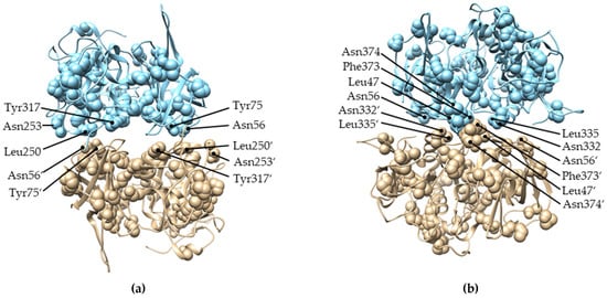 Residues responsible for type I functional divergence between Amorphea and Alveolate DPPIs mapped on the structure of human DPPI (PDB accession code 1k3b). For clarity of presentation, two subunits of DPPI are shown in a (a) head-to-tail interaction and (b) lateral interaction. Apostrophes are used to distinguish residues from different subunits.