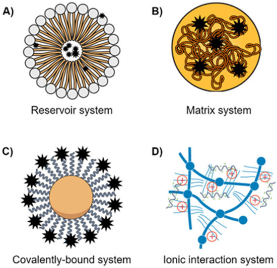 The use of nanoparticles (NPs) as carriers for chemotherapeutic agents has significantly improved their effectiveness, safety, stability, and pharmacokinetic profile [9,12,16]. Biocompatible nanocarriers can be tailored to suit the pathophysiology of the tumors and enhance the physicochemical properties of the drug and its permeability and retention time due to their unique sizes and possible surface modifications [12,14,16,17]. Furthermore, improvement in drug targeting by encapsulation in suitable NPs reduces the adverse effects associated with chemotherapy as normal cells are protected from the cytotoxic effect of the anticancer drugs [12,16,18]. Several strategies have been used for the encapsulation and loading of the therapeutic agent on the nano system. The selected techniques depend on the formulation procedure, carrier system, and physio-chemical properties of the pristine agent (Figure 1). Anticancer drugs may be loaded within the empty core of the NPs (Reservoir system), distributed evenly within the polymer matrix (Matrix system), conjugated covalently to the nanocarrier (Covalently bound system), or have an ionic interaction between oppositely charged ions (Ionic interaction system) [19].