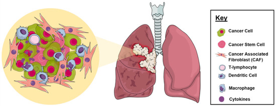 Currently, it is well accepted that a subpopulation of LC cells residing within the tumor tissue exhibits unique biological phenotypes and characteristics with stem cell capacities, including lineage differentiation and self-renewal [66]. In addition, they can further undergo invasion, metastasis, tumorigenesis, chemoresistance, and tumor relapse and can escape immune surveillance. These cells will be henceforth referred to as cancer stem cells (CSCs) [67]. Studies have shown the vital role CSCs play in the occurrence and development of LC tissue, outlining their significance in mediating all cancer hallmarks. Recent studies suggest that the “stemness” of tumor cells may be caused by genetic mutations to specific genes, including TP53, or acquired through the activity of cancer microenvironment substances, such as interleukins, nitric oxide, or hypoxic conditions. This situates the CSCs within a setting rich with external signals, such as cytokines, growth factors, extracellular matrices, and other physicochemical factors and surrounded by a variety of cells, such as immune cells, stromal cells, endothelial cells, and perivascular cells [66,67,68,69,70]. Several biomarkers have already been identified within LC, including ALDH1, CD133, CD44, CD166, CD20, and others [68]. Understanding the CSC environment may well provide effective therapeutic strategies to overcome the aforementioned barriers, thereby achieving an improved therapeutic outcome and a lower rate of tumor recurrence.
