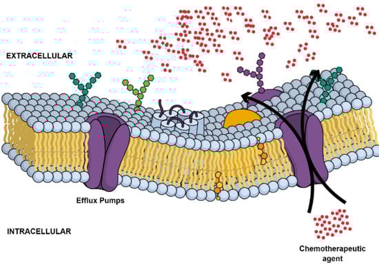 Tumor multidrug resistance (MDR) remains a major obstacle that continues to hinder the effective progression of current curative cancer therapy in LC [42]. Innate and acquired phenotypes have been frequently identified as major cancer cell defense mechanisms following exposure to chemotherapeutic regimens [43]. Until now, several MDR mechanisms have been increasingly linked to members of the ATP-binding cassette (ABC) membrane pumps with 48 identified genes [44]. A number of these efflux transporters, including P-glycoprotein (P-gp; ABCB1; MDR1), breast cancer resistance protein (BCRP; ABCG2), and MDR-associated protein 1 (MRP1; ABCC1), have been recognized as reducing the efficacy of anticancer agents in tumor cells through a noticeable decrease in their intracellular accumulation in an ATP-dependent manner (Figure 3) [45]. Commonly used chemotherapeutic agents, including taxanes, platinum compounds, and gemcitabine, fall victim to these pathways [46,47,48,49].