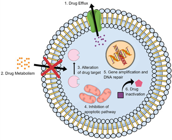 Resistance to chemotherapeutic agents can be due to alteration in their targets at the tumor sites. These changes occur due to molecular modifications that may begin by mutation in DNA and alterations in protein expression, resulting in a decrease in the affinity of the drugs with their binding targets and DR (Figure 4). For example, treatment of SCLC with DOX in combination with platinum drugs inhibits the topoisomerase enzymes in the cells by intercalation between the DNA bases, causing inhibition to the enzyme gyrase that is responsible unwinding the structure of DNA during the DNA replication and ultimately causing DNA breakage. Many of resistant cancer cells can survive this treatment by modifying topoisomerase II gene expression and hence altering the target of DOX [78,139].