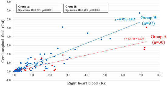 Both Groups A and B showed a high correlation between right heart blood (Rs) (x) and CSF (y) caffeine concentrations (Group A: y = 0.470x + 0.026, r = 0.795, p < 0.0001; Group B: y = 0.823x − 0.017, r = 0.903, p < 0.0001). The distribution of caffeine in the scatter plot was more biased toward the Rs side in Group A than in Group B (Figure 1 and Table 1).