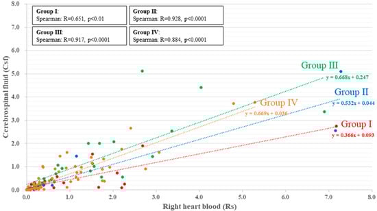 The correlation between the concentration of caffeine in Rs and that in CSF in Groups I (red), II (blue), III (green), and IV (orange). There is a correlation between the concentration of caffeine in Rs and in CSF in all groups (Group I: r = 0.651, p < 0.01; Group II: r = 0.928, p < 0.0001; Group III: r = 0.917, p < 0.0001; Group IV: r = 0.884, p < 0.0001). The concentration of caffeine is higher in Rs than in CSF in Groups I and II.