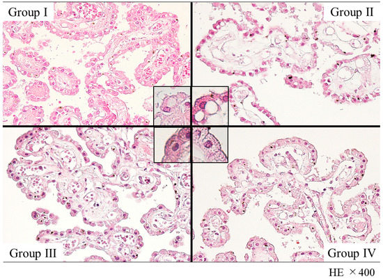 The histopathological findings of choroid plexus epithelial cells in autopsy cases in each group (H&E staining 400×). Cytoplasmic vacuolations are seen. In particular, more than 10% of choroid plexus epithelial cells have cytoplasmic vacuolations in Groups I (27.5%) and II (13.6%), with 9.2% in Group III and 2.1% in Group IV.